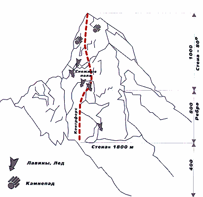 схема предоставлена редакцией журнала "На Грани" Все участники экспедиции вернулись. Наиболее "сохранившиеся" уже даже успели съездить на родные Большие Скалы. Вот что рассказывают "выжившие в катаклизме": Базовый лагерь разбили примерно на отметке 4600. К стене подход по леднику, с высоты 4800 начинается ледовый взлет: протяженностью около километра и крутизной в среднем 55 градусов. Взлет этот пропилен лавинным кулуаром, впоследствии сыгравшим роковую роль во всей истории. Выше начинается собственно стена: 600 метров монолитных скал с многочисленными карнизами, потом примерно полкилометра вертикали с полками и еще около 300 метров снежной шапки. Сергей Ефимов сразу воспринял гору как недружественную, даже обсуждал эти свои ощущения в базовом лагере с друзьями. Погоды не было почти что месяц подряд, порешили лезть в любую погоду. Из-за непогоды дело продвигалось медленнее, чем расчитывали. Успели пройти только лед и 4 веревки скал, неделю отсиживались в висячих платформах; снегопад был такой мощный, что выставленная наружу кружка заполнялась снегом на глазах. Первое ЧП произошло, когда Юрий Кошеленко поднимался по закрепленным перилам, чтобы поснимать на видеокамеру работу на стене. Камень ударил прямо по рукам, по жумару. Итог - переломы пальцев. Подниматься дальше он не мог, Одинцов принял решение: спускаем Юру и лезем дальше. Спускали его верхом на бауле со снаряжением. На километровом участке льда техника была такая: через закрепленную "спусковуху" выдавали баул с Кошеленко, спускались к нему, делали станцию, Одинцов подходил к остальным с нижней страховкой.