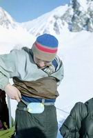 Погода портилась плавно, но неуклонно. Итог: не дойдя до следующего перевала метров 300, мы стали рыть снежную пещеру. Причем ветер уже норовил вырвать лопату из рук. Поскольку копать начали еще до обеда, и времени было много, нас накрыл жестокий приступ гигантомании. При желании в нашей пещере можно было бы устроить неплохой дансинг, а уж про то, что можно встать в полный рост, я просто не упоминаю. Не спонсорам в угоду, а практической пользы для отмечу, что во многом наш успех в деле уборки снегов Сибири был обеспечен многочисленными снегоуборочными инструментами. В наличии имелись: алюминиевая лопата Nig Impex, лопата Ortovox с лексановым лезвием, дюралевая складная пила для снега (тоже Ortovox) и самопальная классическая лопата, в прошлой жизни - поддон от холодильника Димы Булавинова. Алюминиевой лопатой и ножовкой мы вгрызались в толщу плотного снега, а двумя остальными приборами руда выгружалась в отвалы. Работали посменно, бесплатно, но без забастовок. В этой замечательной пещере прошел остаток дня. Потом весь следующий, благо это было как раз 8 марта, а спирт носила как раз наша единственная участница, и ей как раз было очень тяжело его носить. 9 марта погода почему-то не улучшилась, а даже наоборот. При этом с невидимой сквозь метель стены цирка напротив все отчетливей доносился гул сходящих лавин. Вылезя на улицу, мы с ужасом поняли, что за минувшие сутки выпало около метра свежего снега, и надо делать ноги куда-нибудь подальше от любых склонов. Давненько не было так страшно... Некстати вспомнились ужасные рассказы местных спасателей. Надежда на биперы и благославение начала казаться призрачной... С выпученными глазами мы ломанулись вниз по долине. И не зря: склоны действительно были перегружены. Уже в зоне леса, в относительной безопасности, я ради эксперимента специально подрезал маленькие склончики (метра по 3 высотой) на бортах ручьев. Результат был предсказуем до омерзения: склон сходил.