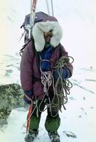 Решили рубиться сквозь метель и тропежку до Байкала, в надежде, что там погода лучше и снег сдут с поверхности льда. С попыткой взойти на Черского с юго-западной стороны, таким образом, пришлось распрощаться. Как в известном анекдоте про Илью Муромца и Змея: "Ну, гнида, ну, червяк навозный... зато жив остался!" Но до Байкала мы в тот день не дошли - немного совсем, километра 3. Ерунда; решили, завтра утром полчаса - и мы на озере, как у Христа за пазухой. Ночью пошел дождь. Дальнейшее не загадка: метр свежего снега полейте водой и включите температуру +3С, после этого оденьте лыжи и двигайтесь в нужном направлении. Успехов! Снизу мы лыжи очень густо смазали парафином, но вот сверху - не догадались. В общем, во второй половине дня мы вышли на туманный байкальский брег. На этих трех км скорость не превышала нескольких сотен метров в час, да еще и настойчиво начало ломаться снаряжние; от усердия тропящих крепления отрывались от лыж, несмотря на все шурупы. Но самое главное ждало нас впереди: НА БАЙКАЛЕ БЫЛО ТОЖЕ САМОЕ! Это был удар... Спасения пришло с неожиданной стороны в виде местного жителя, известного в узких кругах под именем Паша Колдун. Паша как раз вышел из своего зимовья посмотреть, сколько глупых налимов за минувшие сутки залезло в его сети. Налимов было много, одному ему такое количество ни в жизнь не съесть. Пришлось протянуть руку братской помощи. Рука была снабжена ложкой. Пашина изба в мгновение ока была превращена в сушилку. Благодаря потере влаги снаряжение полегчало вдвое. До поздней ночи мы бегали на улицу смотреть на термометр и вымолили-таки похолодание. Утром снег на Байкале покрылся тоненькой корочкой наста; впрочем, это никак не спасало нас от тропежки, разве что вдохновляло морально. Зато под снегом выступала вода...
