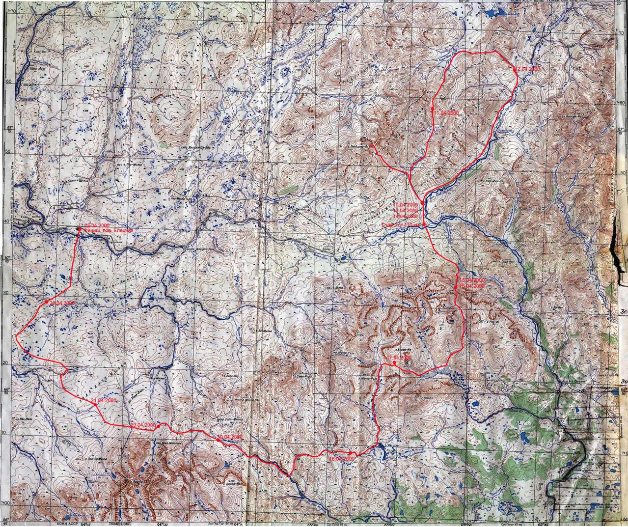Пересекаем р. Хорута (некоторое время занимает поиск переправы, поскольку река уже начинает вскрываться) и начинаем пологий спуск на северо-запад параллельно р. Прав.Кеч-Пель в направлении увала Каче-Мыльк. Тут еще можно идти на лыжах, хотя снега практически нет.