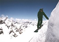 День шестой. Восхождение на Лекзыр через перевал Гумачи ложный. Надо отметить, что Лекзыр находится на территории Грузии (Сванетия), так что не обошлось без нарушения госграницы. Путь от перевала до подножья горы сплошь усеян трещинами. Когда подошли к стене, по которой планировался спуск, меня начали мучить сомнения. Передо мной был 60 (!) градусный склон и, помня, как мне было "весело" на Гумачах, я уже было, решил съехать прямо с того места, где стоял. Успокаивало одно - склон был весь день на солнце, и снег должен быть мягкий (и одновременно лавиноопасный). Я подумал: "Когда у меня ещё будет возможность съехать в ТАКОМ месте?". И пошел вверх. На вершине мне стало немного не по себе. Когда, пристегнув доску, я посмотрел вниз, то увидел практически отвесную стену. 60-градусный склон выглядит очень по-разному, когда на него смотришь снизу и когда готовишься ехать по нему. Благо, снег был мягкий, и можно было при желании даже остановиться на этой стене. В плане катания, пожалуй, это был лучший день: снега было очень много, угол на протяжении почти всего спуска составлял менее 30 градусов, так что удовольствия была масса. В этот же день поднялись до скал Аристова и съехали практически, не останавливаясь до самого низа. Правда, не обошлось без происшествий: Леля сорвалась и пролетела кубарем метров 50, перескочила трещину по узенькому мостику, потеряла очки и телескопическую палку с рюкзака (палку на следующий день нашли).
